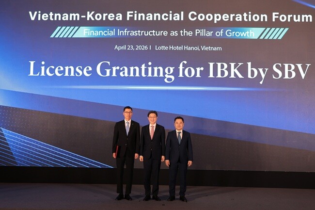 | ▲지난 23일 베트남 하노이에서 열린 한·베 금융협력포럼에서 (왼쪽부터) 장민영 IBK기업은행장, 이억원 금융위원장, 응우옌 응옥 칸 베트남 중앙은행 부총재가 기념촬영을 하고 있는 모습/사진=IBK기업은행 제공 |