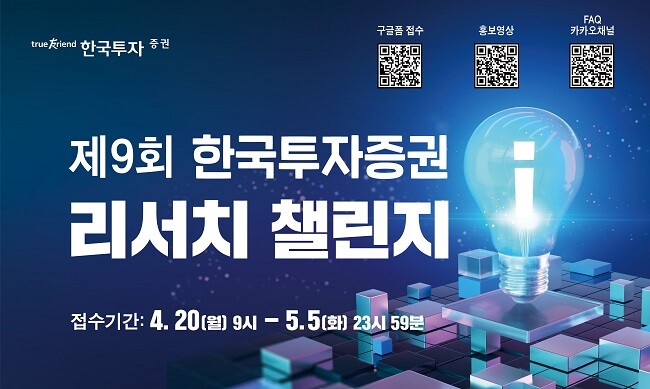 한국금융지주 자회사 한국투자증권(사장 김성환)은 리서치 애널리스트를 꿈꾸는 우수 인재를 발굴하기 위한 ‘제9회 한국투자증권 리서치 챌린지’를 개최한다고 21일 밝혔다.