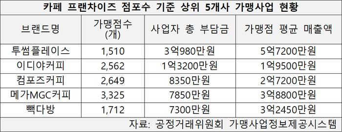 17일 공정거래위원회 가맹사업정보제공시스템에 따르면 2024년 기준 가맹점 개설 시 점주가 부담해야 하는 총 비용은 투썸플레이스가 약 3억980만원으로 가장 높았다. 이는 이디야커피(1억3232만원)보다 두 배 이상 높은 수준이다.